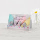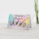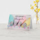Grattis på födelsedagen kort med ett vackert pastellfärgat fotografi. Med tårtsmyckningsartiklar i pastellblått, rosa, persika och gult. Uppställd på ett trädiskbord med små färgglada pärlor.