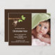 Vår lilla apa har anlänt bebis pojke foto födelse meddelande är ett sött sätt att meddela din familj och vänner att din lilla sötnos har anlänt. Födelsedeklarationskort med den söteste lilla apan som hänger från en trädgren på en brun bakgrund med en prickig accent. Lägg till ditt foto och information och du är redo att gå! ©cocoa studio