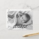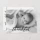 Personliggjord med barnets foto på framsidan och ett speciellt meddelande på baksidan. Denna design använder ordet "Tacksam" i en elegant, handskriven typsnittsstil för en touch av sofistikation. Uttryck din glädje när du tillkännager födseln av ditt barn och skicka din tacksamhet samtidigt.