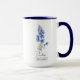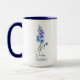 Födelsemånadsblomman juli Larkspur mugg med en illustration av en larkspurblomma. Under blomman skrivs namn i ett snyggt-skript. Under namn anges stater "Juli - Larkspur" som anger att ägarens födelsemånad är juli och hennes födelseblomma är larkspurten. Det är ett personlig mugg, skapat som en tänkbar gåva till någon som föddes i juli.