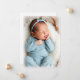 Födelsemeddelandekort för babypojke med blå tema där du kan lägga till ditt favoritfoto på framsidan. En vit gradientfotoöverlagring mjukar upp kanterna på fotot - denna effekt kan stängas av i designverktyget.