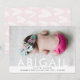 Välkomligt skräddarsytt födelsemeddelande från flicka för att tala om för vänner och familj om er nyfödd bebis ankomst. Anpassa korten med ditt fotografi, ditt barns namn och den information om hennes födsel som du vill - t.ex. födelsedatum, tid, vikt och längd. Födelsemeddelandet i baby går tillbaka till rosa och vitt hjärta mönster.