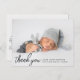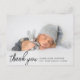 Det här moderna och eleganta födelsekortet har ett vackert tack och barnets fullständiga namn och födelsedatum. Det finns utrymme på baksidan av vykortet att skriva anpassad text eller ta bort texten för handskrivet meddelande.