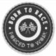 Hjulformad ord-konsformad formgivning "född till tävling", glatt stil fet text, tävla flaggor och "tvingad att arbeta" i brev som tillverkats av verktyg och bildelar.