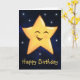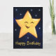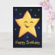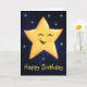 Söt glad gul stjärna på en mörkblå galaxbakgrund med små tindrande stjärnor runt omkring. Nedanför stjärnan står orden Grattis på födelsedagen med gula bokstäver. Inuti finns ett födelsedagsmeddelande som du kan använda som det är eller använda mallrutan för att ersätta meddelandet med ditt eget. Om du vill lämna insidan tom kan du helt enkelt ta bort meddelandet i textrutan.