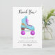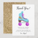 Roligt tackkort för födelsedagsfest med tema rullskridskoåkning och vintage-vibbar. Det finns en handritad illustration av en rullskridsko i rosa och blå färger med en falsk guldglitterblixt formad som en blixt som är tryckt på den. I standardmeddelandet står det "tack för att du kom förbi". Anpassa denna produkt genom att lägga till ditt barns namn.