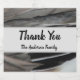 Ett foto av fjädrar från anka lägger till personligens märkningsmärke för öl skapande vågrät rand av fjädrar. Grått- och svartfågelfjädrarna tillför denna moderna märkning en viss natur och en unik abstrakt inslag. "Tack" och din familjs namn visas i en lätt grått-banderoll. All text kan lätt vara personlig.