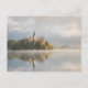 Vykort för en dimmig soluppgång i Bled Sjö med kyrkan och dimma i vatten under förmiddagens första solljus i Slovenien.