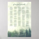 Detta vackra bröllop-sittdiagram har en rustik vattenfärg på en trädbevuxen bergsyta som är täckt av grönt gräs träd och som är täckt av dimma eller dimma. Rubriken lyder "hitta bord" i elegantens äldre skriptkalligrafi. Det finns utrymme för upp till 250 namn med namn av paret och bröllop nedan. Perfekt för mottagning utomhus eller i bergsområden.
