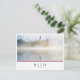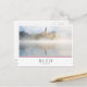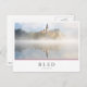 Fotovykort av en dimmig soluppgång vid Sjö Bled med en reflektion över ön med kyrkan längst vatten vid sjö och med Bled Castle i bakgrunden på en vacker höstdag i Slovenien med ett vitt kant, med linjer i färg, vitt, blått och rött, färg i den slovenska flagga och texten "Bled, Slovenien".