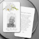 Elegant vita orkidéer, ett foto och uppgifter om din firande i livet på framsidan och på Herrens bön, eller vilken bön som helst, på baksidan, skriv bara in texten. Snygg att ta med vid en begravning, en minnesstund, en dödsdag eller i tackkort. MATCHING-objekt i vår samling.