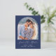 Den här enkla, minimalistiska boho Spara vykortet för datum innehåller ett bågformat foto ovanför orden "Spara datum" i ett vitt handskriftsskript för elegant, följt av parets namn, bröllop datum och stad i sans serif-teckensnitt på en marin blå bakgrund. Lägg till din returadress och ytterligare text med mer information och information, tillsammans med en QR-kod som hjälper dina gäster att besöka webbplatsen för bröllop.