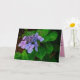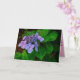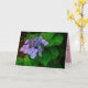 This sympathy card in landscape format introduces a photo of a purple lacecap hydrangea on the cover. The card is folded in horizontal format; the inside color is pink and the card expresses sympathy for loss.