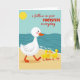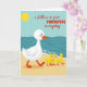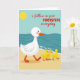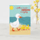 Det här kortet visar en lugn strandscen där en stor vit vattenfågel med rosiga kinder, en orange näbb och orange simhudar vandrar över varm gyllene sand från vänster till höger. Tätt bakom följer tre små gula kycklingar på rad och lutar sig mot ledaren med en tillgiven och förtroendefull närhet ❤️. I det övre vänstra hörnet sitter en rund gul sol mot en mjuk blå himmel som tonar av mot en djup tealfärgad ocean. Längs strandlinjen rullar enkla vågformer in med tunna vita skum märken, vilket ger vattnet en mjuk, stadig rytm. Tvärs över mitten står “i follow in your FOOTSTEPS everyday,” med “FOOTSTEPS” med versaler och resten med gemener för kontrast. Texten ligger över scenen utan att täcka fåglarna, så att processionen kan vara i centrum
