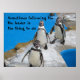 Digitalt fotografi av 3 penguiner som slungar längs en gångväg i deras djurparksmiljö. Med texten: "Att följa ledaren är sak att göra!"