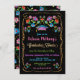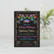 Färgglada och vackra mexikanska fiesta-examensfirande-inbjudningar med falskt guldglitterram och typsnitt. Denna är för en examen från antingen high school eller college. Har handritade, brodyrstukna blommor, examenshatt och maracas på svart bakgrund.