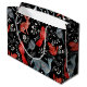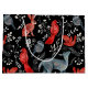 Illustrated black background features patterned red and blue birds, a rabbit, and a deer among white floral designs, creating a whimsical, folk-art style.