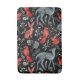 Illustrated black background features patterned red and blue birds, a rabbit, and a deer among white floral designs, creating a whimsical, folk-art style.