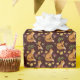 A charming pattern of seated orange foxes surrounded by yellow and purple flowers, green leaves, and dotted accents on a rich burgundy background.