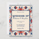 Bröllopsinbjudan, Röd, vit och blå, folkkonst blommande geometrisk. Unik, bohemisk chic.