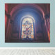 Bilden fångar upp ett stort glasfönster i en nedfläckad i en kyrka, som tappas i mjukt, varmt ljus. I fönstret visas en biblisk scen med flera figurer, som troligen representerar en religiösa artikel. Färg är vibrerande och rik, med röda, blå, gult och grönt som dominerar scenen. Fönstret ramas av en bågformig dörr med ornerade detaljer på de omgivande väggarna.