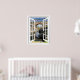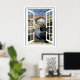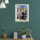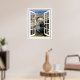 Snygg rustik-gradens fönstervy med flod och blå himmel. Bild i den gamla bryggvyn genom fönster på anpassningsbarna poster utskrift.