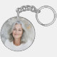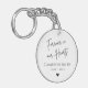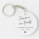 Nyckelkedja på dubblans sida med texten "För i våra hjärtan" i en elegant, handskriven stil-typsnitt, anpassade namn och år och ett anpassningsbar färg hjärta. På baksidan finns en fotomall.