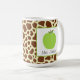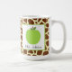 En läraremugg som presenterar en illustration av en grön äppleinsida som en vit kvadrerar med gröntklippning. Bakgrund är girafftrycket.