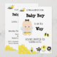 Bakgrunden av detta kort för INBJUDAN för BABY SHOWER för POJKEN för HUMLAN för BABYEN för honungbiet förtjusande söta gulliga nyckfulla roliga moderna är knaprig VIT.