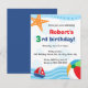 Roligt och färglös för barn födelsedagsfest inbjudan med en strand vid tecknaden boll och båt i en vimisk stil med blå vågar och en orange stjärnfisk. Anpassadets inbjudningstext. Cute design för pojkar, underbar för födelsedagsfester i hav, bassäng eller strand. Om du vill ha anpassningsbar eller hjälp med att anpassa kan du använda butikskontaktlänken ovan.