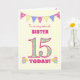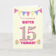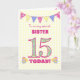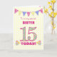 Ett 15:e födelsedagskort för din syster, med prickadullor och nummer fyllda med en primrose mönster, allt på en blek gult check gingham-bakgrund. Det främsta omslaget är: "Till en mycket speciell SISTER 15 I DAG!" Det inre meddelandet är bara ett förslag och du kan enkelt anpassa det eller ta bort det om du vill.