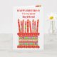 Du kan lägga till åldern till det här briljanta födelsedagskortet för din pojkvän, med en jordgubbsfödelsekaka. Kakan har många ljus med olika mönster och det finns ett mönstrat band runt kakan med färgstarka sommarfrukter - jordgubbar, hallon, kalk och orange. Ovanför kakan är hälsning i röd skrift "GRATTIS PÅ FÖDELSEDAGEN till en mycket speciell bojvän", och på kakan finns det utrymme för er att lägga till åldern, följt av "flera år i dag!" i vitt. Om du vill kan du gärna anpassa det inre meddelandet. Du kan ändra teckensnittet och färg samt meddelandet.