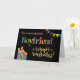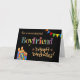Ett starkt och färgstarkt födelsedagskort för en bojvän, med födelsedagsklara Cake Candles, Bunting och Stars och ord,"Boykompis" i mönsterskript, som beskrivs i guld-effekt (inte metallisk bläck) och Grattis på födelsedagen, även i guld-effekt, allt på svart bakgrund. En digital design av Judy Adamson.