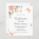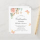En vit bakgrund som dekorerats med eukalyptus greenery, ro guld och rosa ros, guldlöv och fjärilar. Personalisera och en namn och ceremonidetaljer.
