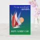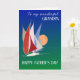 Ett mycket snyggt Fars dag-hälsningskort för din farfar, med ett kluster av tävla-jakter med djupa röda, grå vita och blå seglar. med en enorm, rosaftig orange som ställer in sol i avstånd. Bakgrunden varierar från djupblått överst till mörk grönt vid grund och Art Deco stil-texten är vit. Hälsning är "till min underbara GRANDPA" längst upp och LYCKLIG FARS DAG! vid grund. Det inre meddelandet är bara ett förslag och du kan enkelt ändra det eller ta bort det helt om du vill.