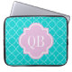 Monogram 15' för galler för för personligturkosblått och vit moroccan laptop sleeve. Modern design med quatrefoilspaljé. Rosa- och vitfärgmonogram med utsmyckad initialer. Chic monogrammed skolar och kontorsmateriel. Gullig gåvaidé för kvinnor och flickaktigt flickor.