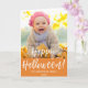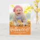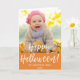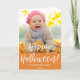 Kortet för happy halloweenfamiljfotoet använder en räcka som skriftlig vit skrivar typografi. Namn, året och fotoet kan bytas ut på det Halloween fotokortet.