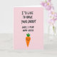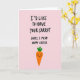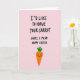 This greeting card features a pale rose background with a simple, modern layout that feels flirty in a light, friendly way 🌷. Near the top, large black text is set in three stacked lines, drawing your eye first. It reads “I’D LIKE TO HAVE YOUR CARROT,” followed just below by “SORRY, I MEAN HAPPY EASTER,” like a quick, bashful correction. The spacing between the lines gives the joke room to land, like a teasing glance followed by a grin 🐰. Centered beneath the words is an orange carrot character in a flat style, giving the design a cute focal point. The carrot has a leafy green top, small curved eyes, and a wide smile that feels like it’s sharing the joke with someone special. Faint horizontal stripes run across the carrot’s body, and the green leaves fan upward against the pink background.