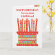 Du kan lägga till åldern till det här briljanta födelsedagskortet för din flickvän, med en jordgubbsfödelsekaka. Kakan har många ljus med olika mönster och det finns ett mönstrat band runt kakan med färgstarka sommarfrukter - jordgubbar, hallon, kalk och orange. Ovanför kakan är hälsning i röd skrift "GRATTIS PÅ FÖDELSEDAGEN till en mycket speciell flickvän", och på kakan finns det utrymme för er att lägga till åldern, följt av "flera år i dag!" i vitt. Om du vill kan du gärna anpassa det inre meddelandet. Du kan ändra teckensnittet och färg samt meddelandet.