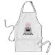 Ett förkläde som presenterar en illustration av en retro vitugn med en rosa kruka som överst sitter. Ugnen är på ett svartvitt golv. Personifiera texten på bästa.
