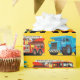 En dumper, en traktor, ett stort rött avfyrar lastbilen och en gul grävare. Alla sorter av konstruktionslastbilar. Underbart för din gammala themed födelsedagsfest för son- eller sonson konstruktionslastbil. Välj din egna bakgrundsfärg, genom att välja ", skräddarsy"/"redigerar"/"bakgrund" för att välja din favorit- bakgrundsfärg eller lämnar den med denna jolly gula bakgrund.