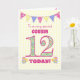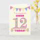 Ett söt 12:e-födelsedagskort för din kusin, med prickadullor, priroblommor och nummer fyllda med en mönster, allt på blekens gult, med ginghambakgrund. Det främsta omslagsbudskapet är: "Till ett mycket speciellt KOUSIN 12 I DAG!" Det inre meddelandet är bara ett förslag och du kan enkelt anpassa det eller ta bort det om du vill.