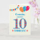 Ett färgstarkt födelsedagskort för en 10-årig kusin. Det stora antalet 10 fyllda med orange, rött och blått mönster, som är skrivet i ljusblått. Det finns ballonger och buntar överst, i matchande färg och framkåpan hälsning är: "Kusin, du är 10 i dag!" i ljusröd och blå skrift, på mycket blek gult och vit polkamera med röd och orange stjärnor på vardera sidan av ord "TODAY!". Om du vill kan du enkelt anpassa eller ta bort det inre meddelandet.