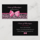Spridning ord om din chic och stilfulla nya hårsalong och beauticianboutique med dessa gulliga och moderiktiga rosa och svart visitkortar för leopardtryckmode med flickaktigt ett shock rosaband som binds i en pilbåge. Personifiera, genom att tillfoga namn av hairstylisten utbildad i cosmetology. Den utskrivavna lägenheten avbildar, den inte faktiska pilbågen.