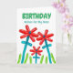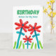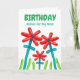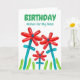 Grattis på födelsedagen för Mamma, anpassade före och insida. Utformning av ljus och färgämnen med ett fotografi av röda blommor med blått grönt och löv, och skarp gräs av grönt skapat med blåballonger. Utformningen av ballongen och trädgårdstemat med kärlek för mor-meddelande. Art, bild och versell copyright © Shoaff Ballanger Studios, 2023.