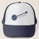 Lägg till namn i ditt blågräsband, din egen roliga slogan eller namn i din favoritbanjo-spelare för att skapa en sån hatt. Detta illustrerar en banjo i marinblått med ert eget budskap skrivet i en samordning av blå text.
