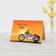 En motorcykel som liknar en Harley som står vid havet med en strålande orange solnedgång. Ett underbart kort för alla som tycker om cyklar och motorcyklar.Se hela korten för åldrar och relationer i min butik. Alla upphovsrätter till teckningar Norma Cornes