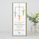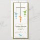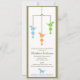 Tre gulliga dinosaurs i blått, grönt och orange hängning från en mobil på denna förtjusande baby showerinbjudan.