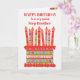 Du kan lägga till åldern till det här briljanta födelsedagskortet för din styvbror, med en jordgubbsfödelsekaka. Kakan har många ljus med olika mönster och det finns ett mönstrat band runt kakan med färgstarka sommarfrukter - jordgubbar, hallon, kalk och orange. Ovanför kakan är hälsning, med rödbokstäver, "GRATTIS PÅ FÖDELSEDAGEN till en mycket speciell Steg Brother", och på kakan finns det utrymme för er att lägga till åldern, följt av "åratal gammal i dag!" med vit text. Om du vill kan du gärna anpassa det inre meddelandet. Du kan ändra teckensnittet och färg samt meddelandet.
