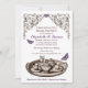 För Teaparty för lilor presenterar trädgårds- brud- inbjudningar en teauppsättning och fjärilar med en blom- rullatitelrad och utsmyckade mönster i lilor, brunt och vit.